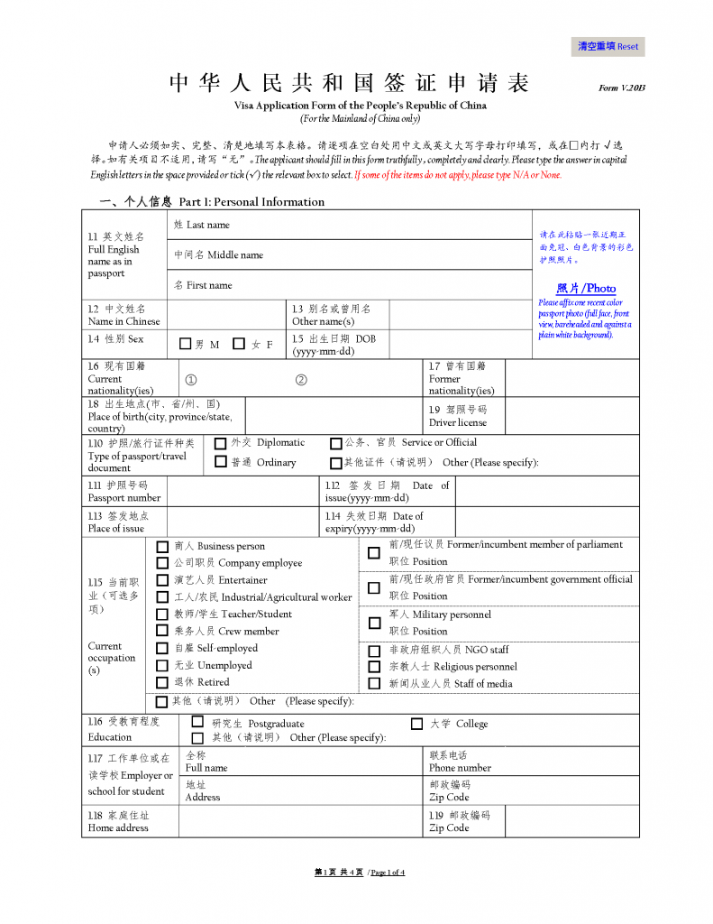 表格下载:中 华 人 民 共 和 国 签 证 申 请 表(洛杉矶领事馆)