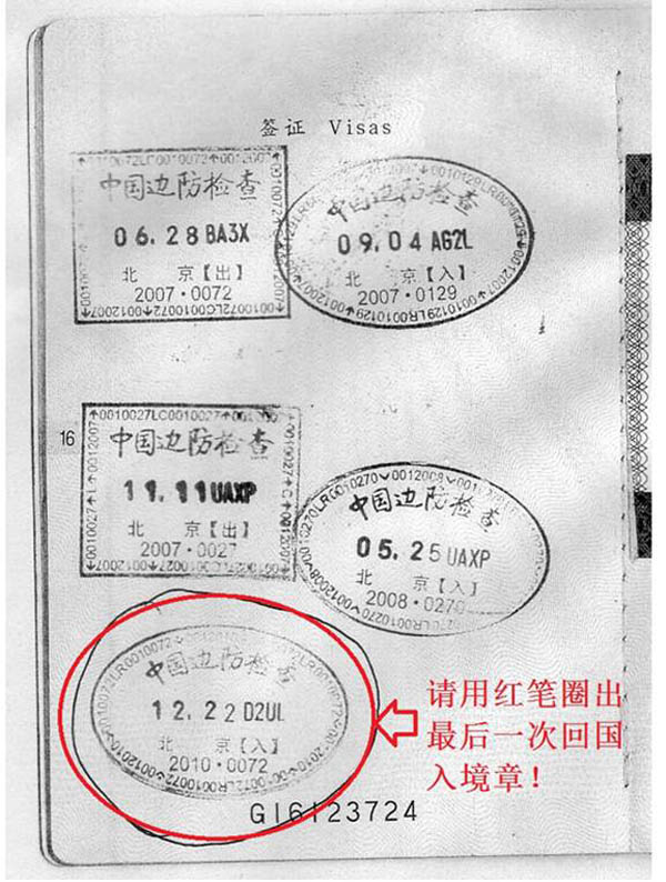 d)回国入境章,也在VISA页上面,并用红笔圈出回到中国的日期(*其实就是护照首页和美国VISA页,然后优雅地画三个指定的红圈)